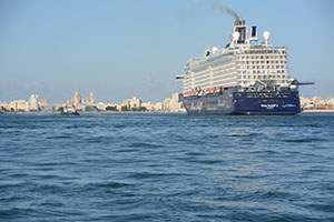 Es ist 8:30 Uhr als wir ablegen. Wir fahren aus dem Hafen als „Mein Schiff 3“ gerade in Cadiz einläuft. Der Kreuzfahrer wird mit einer Wasserfontaine der Bugsierschlepper begrüßt und wir machen erst einmal Platz.