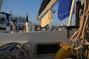 Wir wollen Richtung Denia und bei gutem Wetter die Nacht durch segeln, um Strecke zu machen. Die Welle ist ungemütlich hoch und wir setzen bereits im Hafen das Großsegel. Plötzlich hält mir Klaus ein abgerissenes Ende des Großfalls hin. Das Groß ist oben, kann aber so nicht wieder heruntergenommen werden oder ggf. ein Reff eingebunden werden. Das Fall war noch neu. Grund war ein gebrochener Block (auch neu) der das Fall quasi durchgeschnitten hatte.