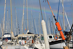 Der Hafen ist relativ leer und wir bekommen einen Platz längsseits am Steg. Klaus nutzt die Gelegenheit zur Pflege des Algengartens unter dem Boot mit Hilfe eines Schrubbers.
