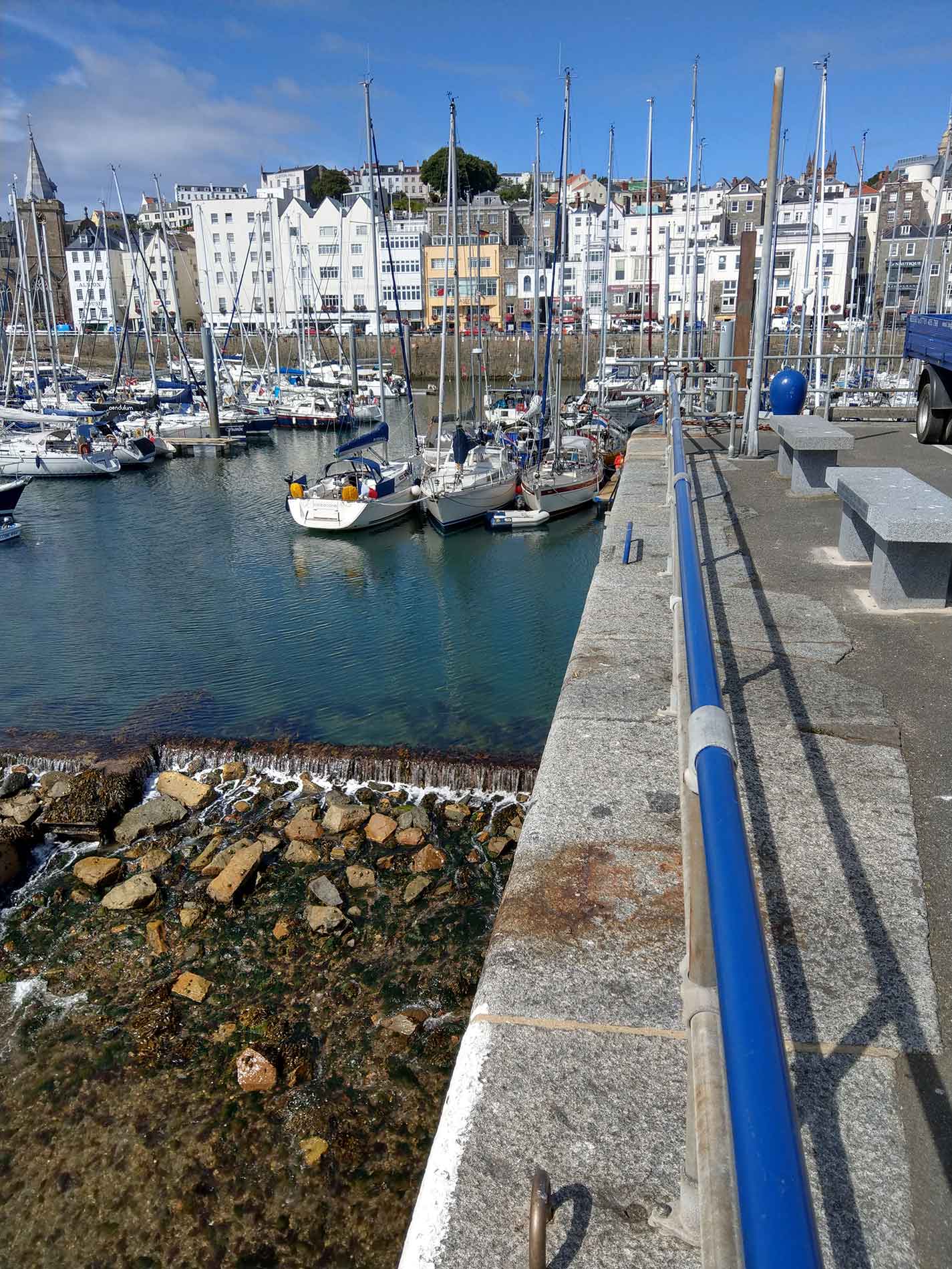 Da wir nicht die einzigen sind, die mit der Tide fahren, erreichen wir mit mehreren anderen Seglern den Hafen St. Peter Port. Der Hafen hat mehrere Teile. Wir wollen in den tidenunabhängigen Bereich. Nachdem wir uns entprechend "eingeordnet" haben, kommt jemand vom Hafen in einem kleinen offenen Boot auf uns zu, sieht die gelbe Flagge und reicht uns erst einmal die Papiere zum Einklarieren. Dann kommt die Frage nach dem Tiefgang und wie lange wir bleiben wollen. Da das Wetter schlechter werden soll und wir uns auch ein wenig auf der Insel umschauen wollen sage ich 2-3 Tage, Darauf winkt der Hafenmeister, wir sollen hinter ihm her fahren um dann schließlich an einem Schlengel längsseits fest zu machen.