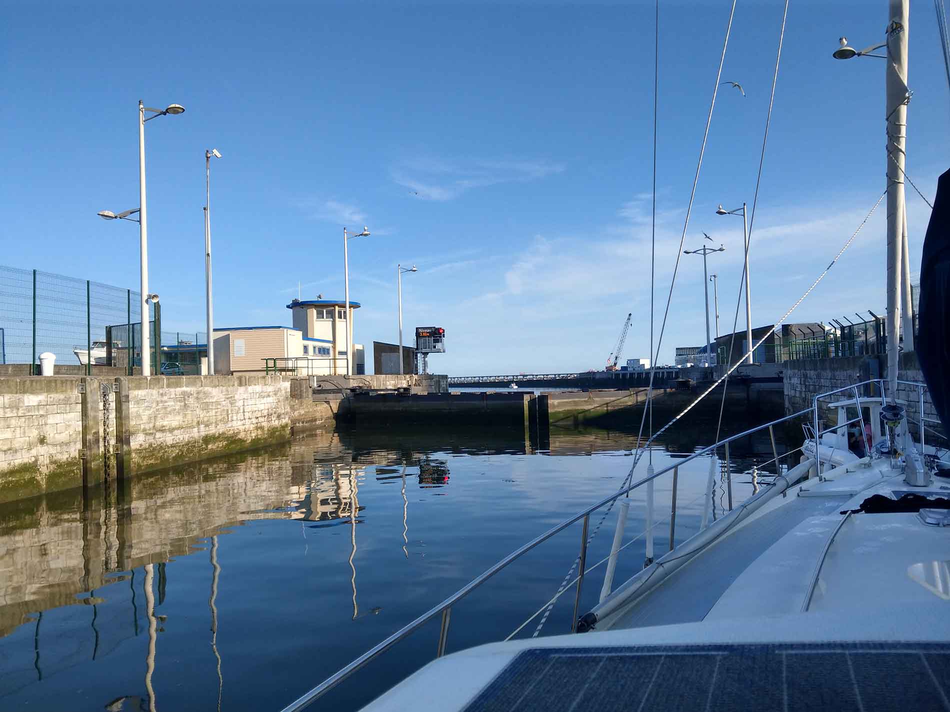 Wir erreichen gegen 16:00 Uhr den Hafen und versuchen im Tidehafenbereich einen Liegeplatz zu bekommen. Leider sind die Ausleger sehr kurz und wir beschließen, in den durch eine Schleuse abgetrennten Hafen zu fahren. Wir haben Glück, die Schleuse ist offen.