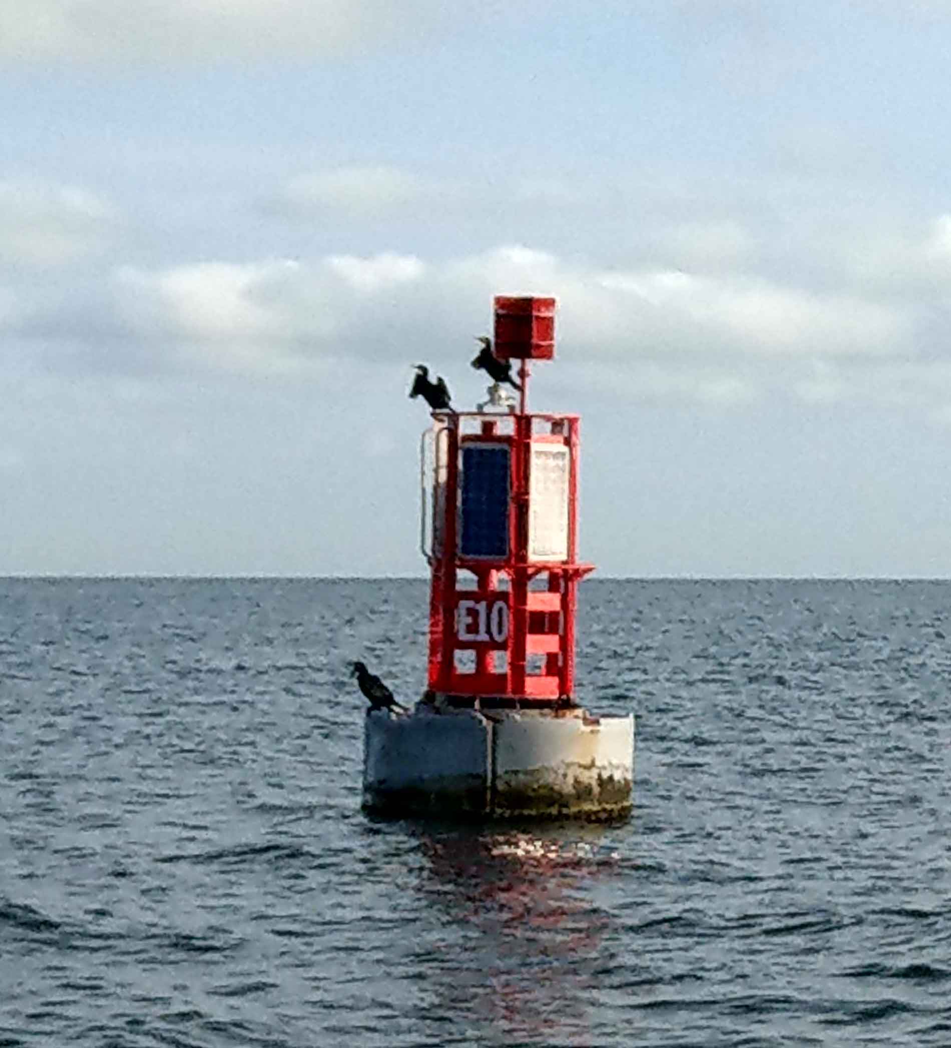 Kormorane sitzen zum Trocknen auf einer Fahrwassertonne.