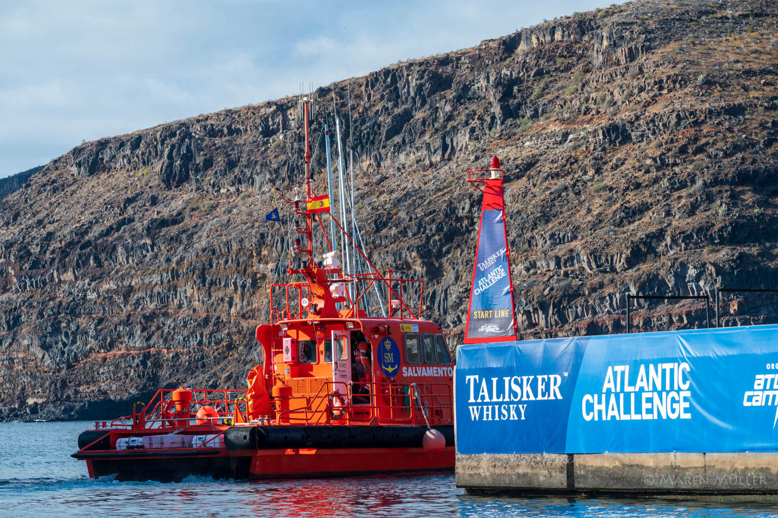 Der Seenotkreuzer platziert sich hinter der Startlinie und verabschiedet alle Teilnehmer mit einer Wasserfontäne.