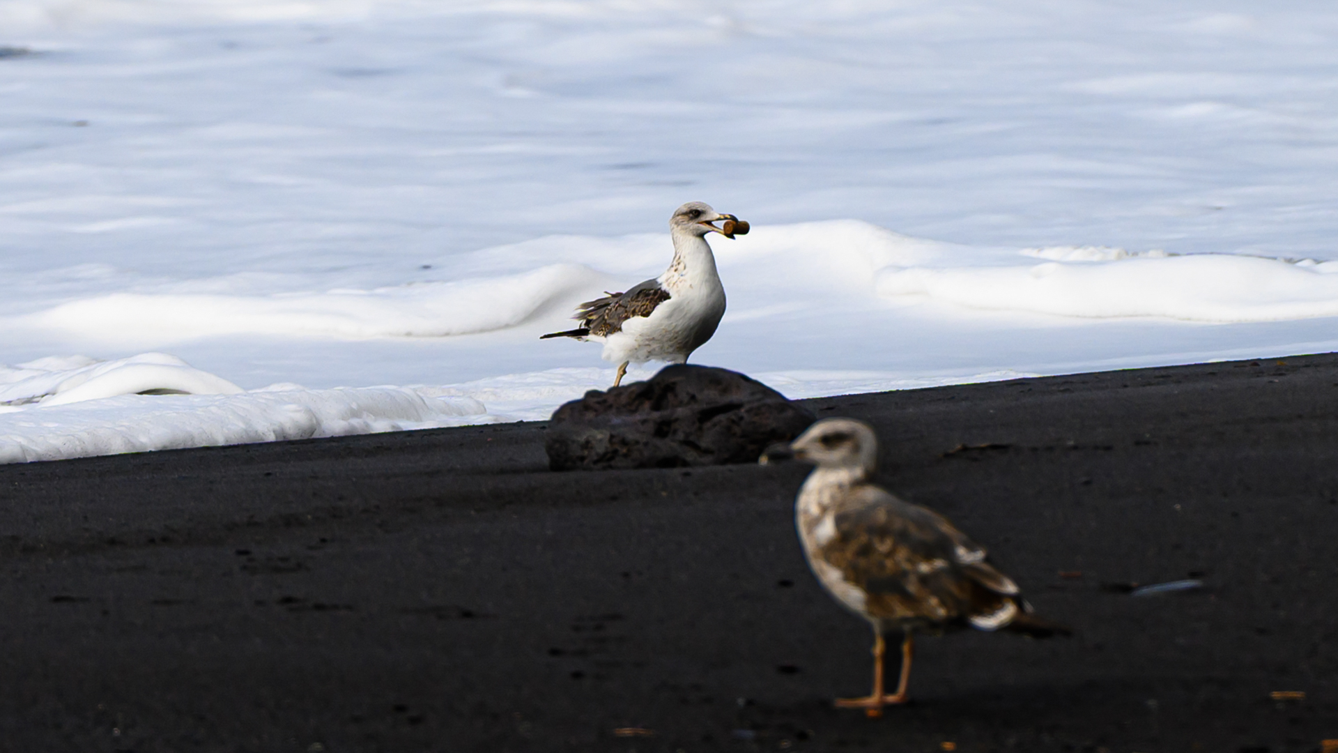 Zwischen den Regenschauern gehe ich immer wieder mit der Kamera los. Der Strand ist gesperrt und ich beobachte Möwen. Warten die auf fliegende Fische, die aus der Welle in den Schnabel fliegen?? Eine junge Möwe fängt sich einen Korken...